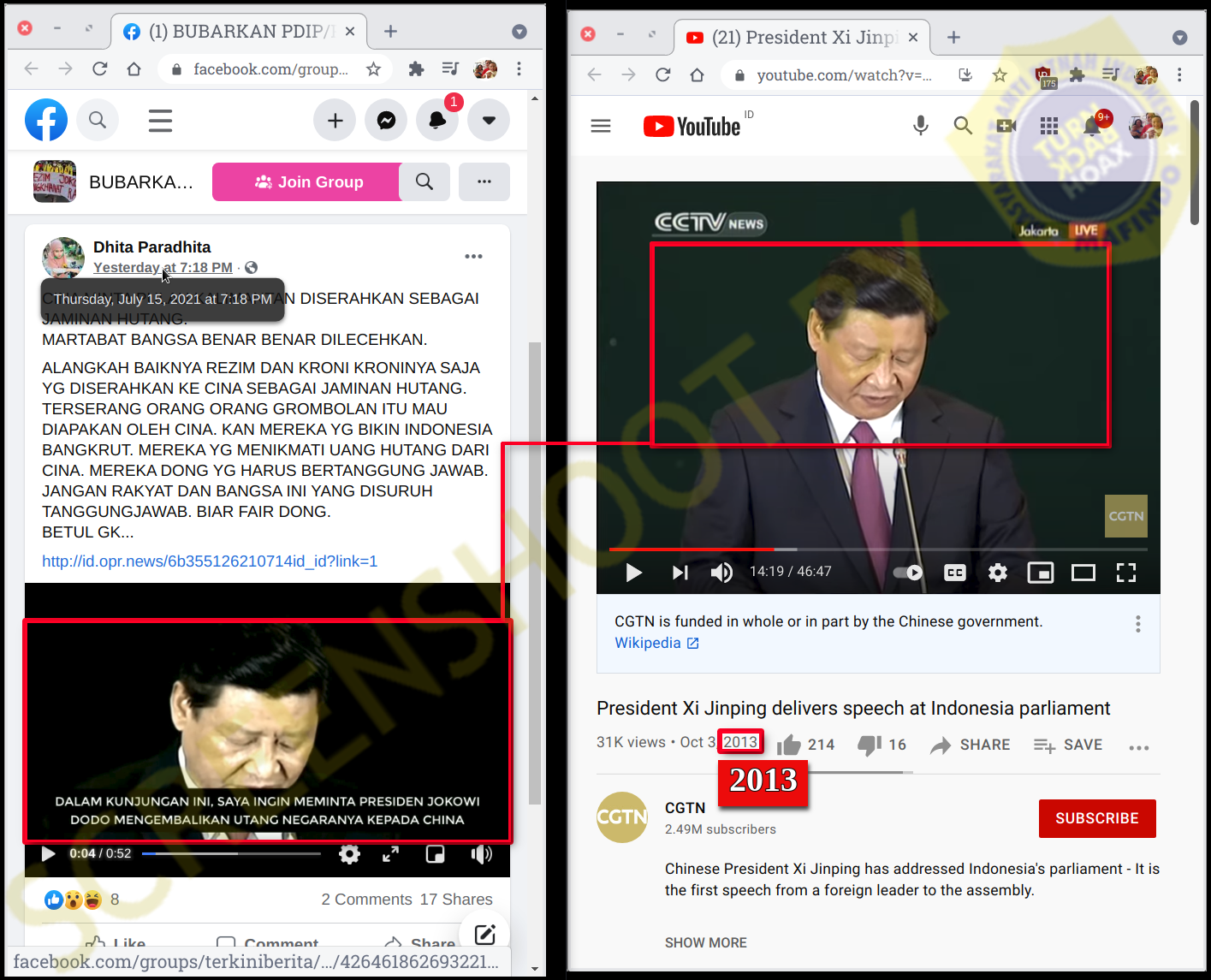 Selain memelintir artikel, video yang dibagikan TIDAK berkaitan dengan klaim. FAKTANYA, artikel yang dipelintir adalah hasil periksa fakta yang menyatakan bahwa isi video TIDAK sesuai dengan thumbnail. Selain itu, video yang dibagikan adalah sesi pidato Xi Jinping ketika bertemu dengan DPR pada tahun 2013, disunting dengan menambahkan teks terjemahan yang TIDAK sesuai dengan arti yang sebenarnya.